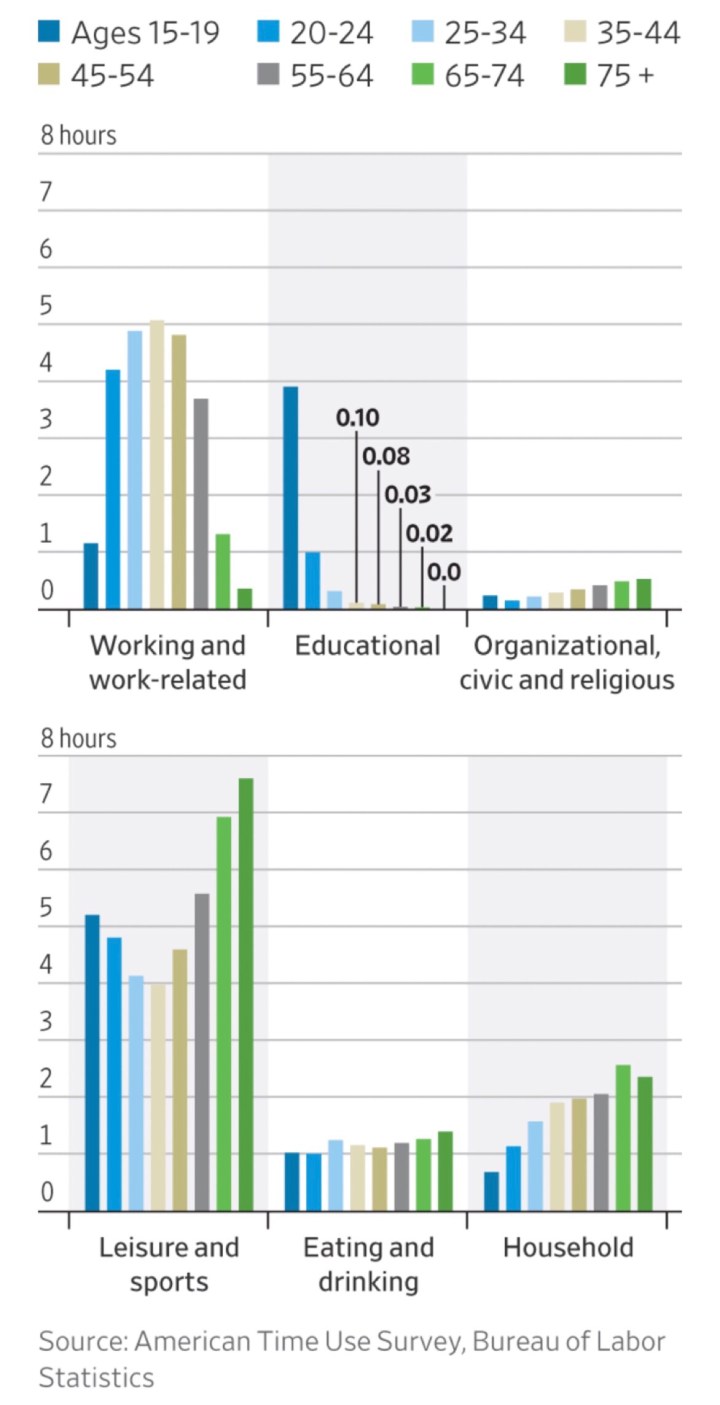 Since I published my Second FIRE Anniversary posts last month, many commented on how busy our activities seem. I do keep pretty busy, but at the same time, most of the activities I am involved in are: 1) voluntary; 2) social; and, 3) focus on fun/leisure/recreation time. While I am involved in board work and do an occasional consulting project, my daily time investment has shifted largely in line with that of other retirees as shown in this chart published with the WSJ article: