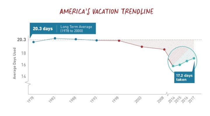 Sadly, according to the study, the number of vacation days people say they take has dropped quite a bit over the last 15 years …