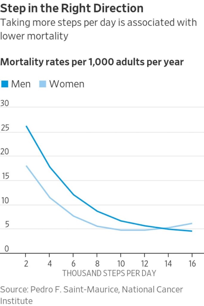 My son recently sent me this great National Cancer Institute chart that shows how important keeping moving is to your overall health. As I’ve written before, few people get even close to 10K steps a day .