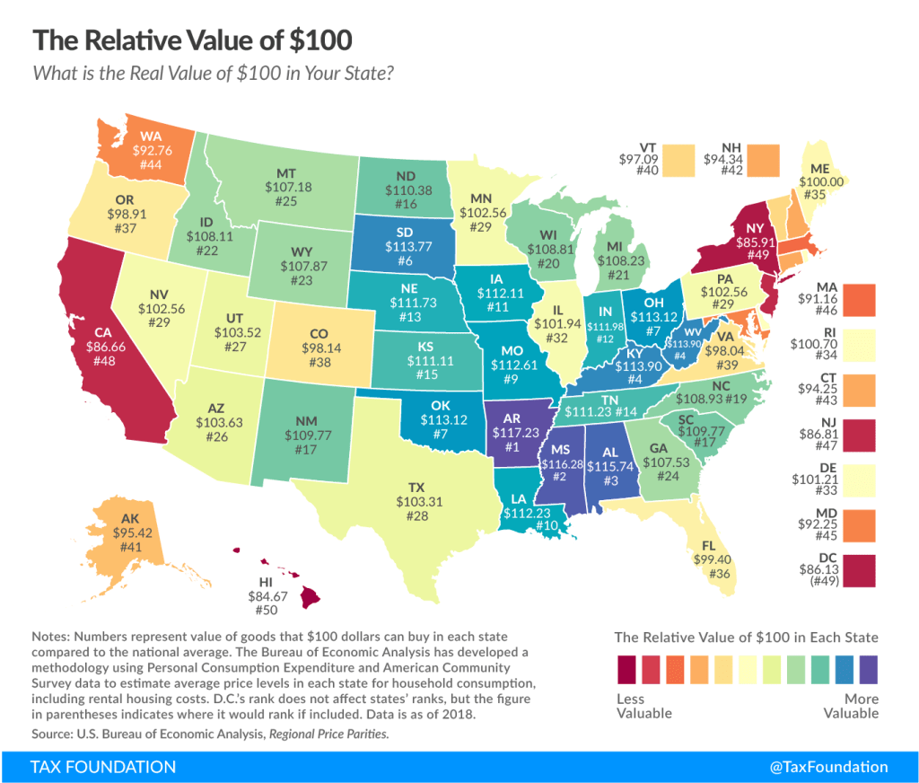 The other side of the equation is the cost of living across the different states. It looks like Minnesota is close to the USA average for the relative value of $100 in spending, so we’re not getting ahead on that count …