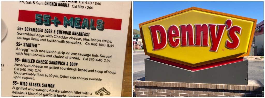 I turned 55 last week and to celebrate the milestone, my friend treated me to my first Senior Discounted meal at breakfast. We went to Denny’s and my 55+ eggs, pancakes, and extra crispy bacon (burn the hell out of them!) cost $8.49.