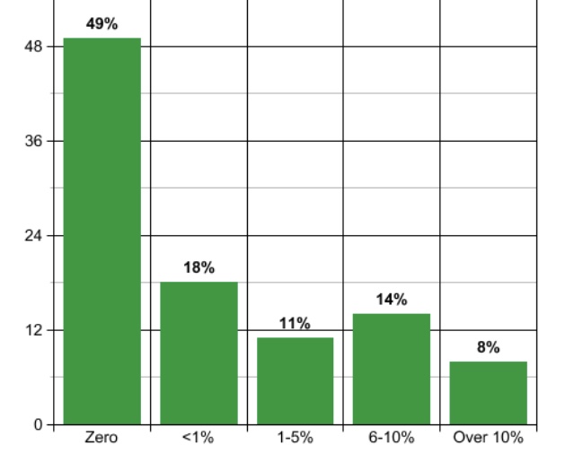 Beyond that, most people have kept their stake at 10% or below. Only 8% of folks have carried more than 10%. Three of the respondents had more than 50%, with one person as high as 80%.