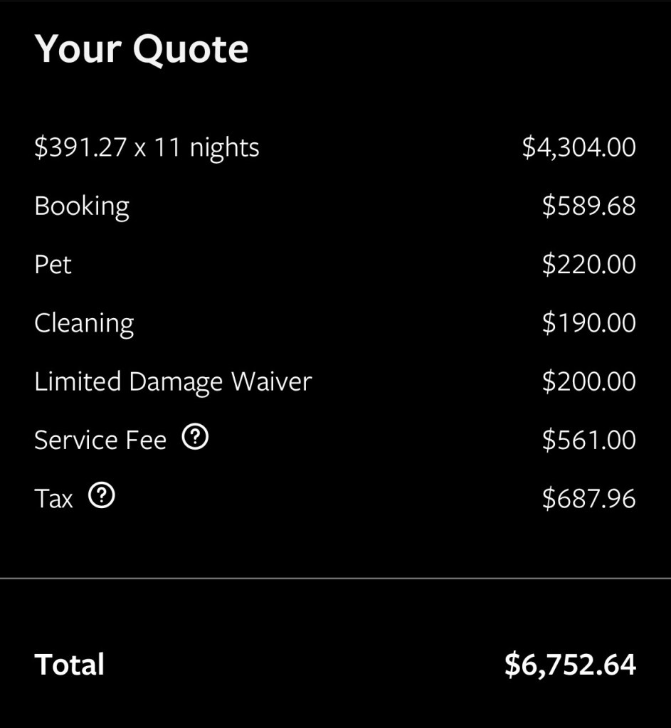 We still prefer VRBO over AirBnB and similar if we’re not using hotels; we like the vetting process. We’ve learned to click on the “full details” link under the price shown to see what all has been tagged on. It’s led to some pretty quick “nope” decisions.