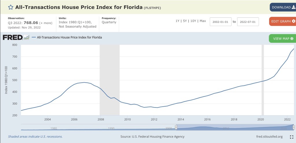 Florida real estate prices keep going up & up. While prices in many places are starting to fall behind rising interest rates, that’s not really happening in Florida. I’m guessing that because a higher share of these transactions are second-homes, the buyers are a bit insulated from the rising cost of borrowing.