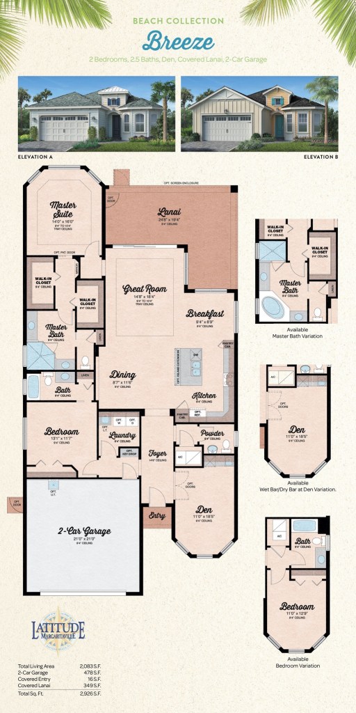 We were drawn in by the “Breeze” cottage. A 3-bedroom villa with a little more than 2K square feet. The model has a big open floor plan living / dining / kitchen area with huge sliding glass walls that seamlessly open the house to the lanai & screened in Florida room / hot tub / pool. This model starts at $400K, but probably tops $700K with all the extras shown in the model.
