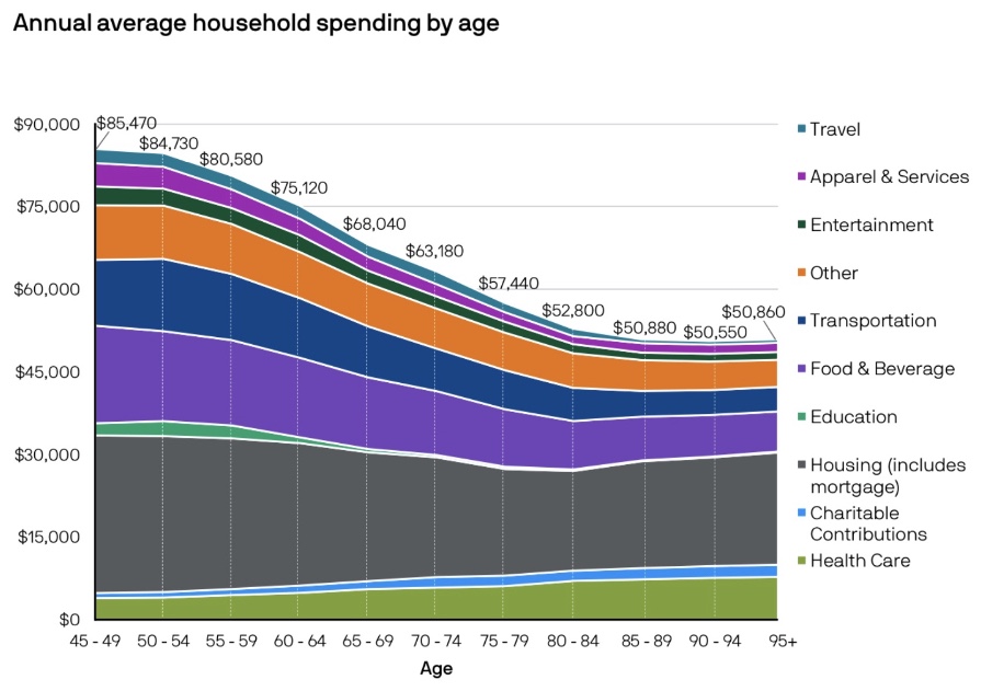 This JP Morgan chart shows ‘the other side of the mountain’ in spending. The average American household slows spending quite a bit as they age … more than I would have guessed.