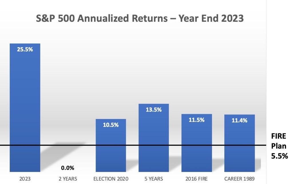 Our retirement plan was conservatively based on 5.5% equity returns (not including dividends). The market has trended WAY ahead of our plans over all of these periods.
