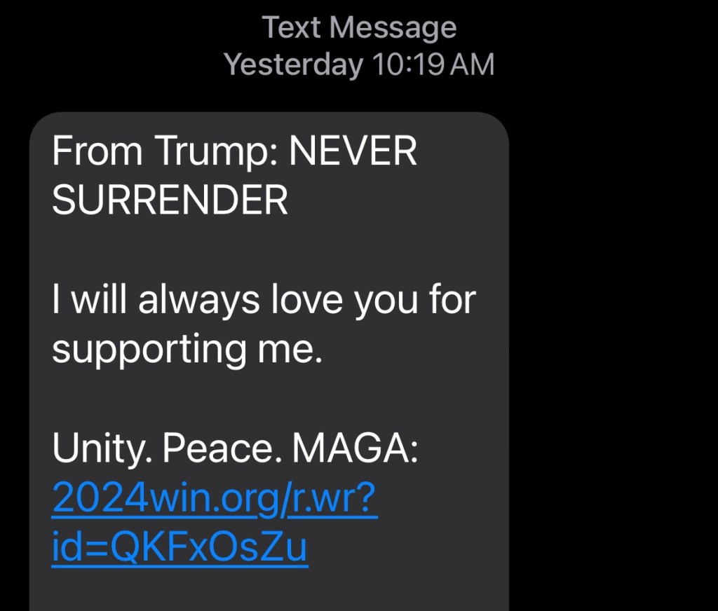 It’s not the first text like this that I’ve gotten this year. I didn’t sign up for anything from Trump or Biden. I certainly wasn’t looking for Trump’s “love”.