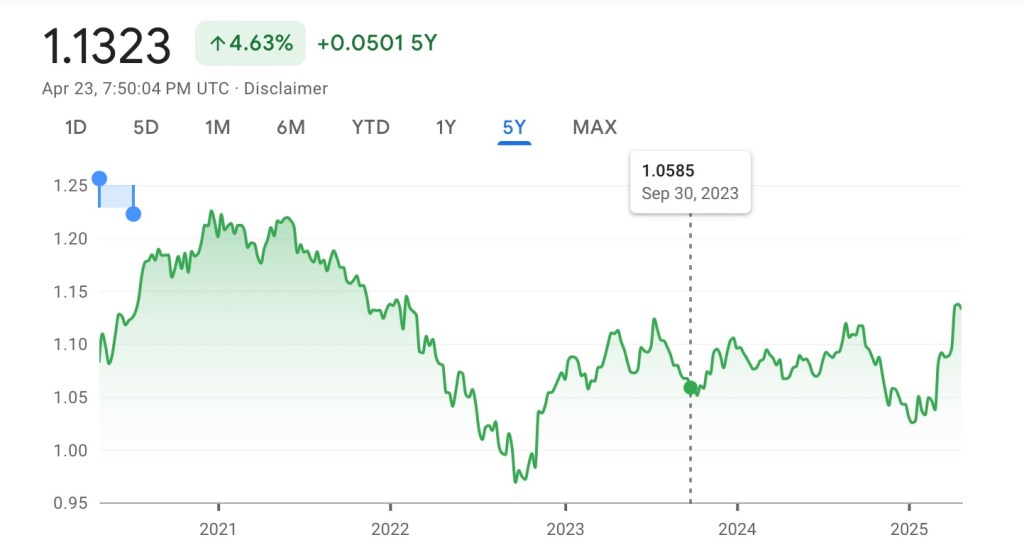 Incidentals for the trip would have been a bit cheaper a month ago, before Trump’s trade strategy beat up the stock market, bond funds, and … the U.S. dollar. What was set to be our best exchange rate ever against the Euro, is now moving back up to where it was during the first Trump Presidency …