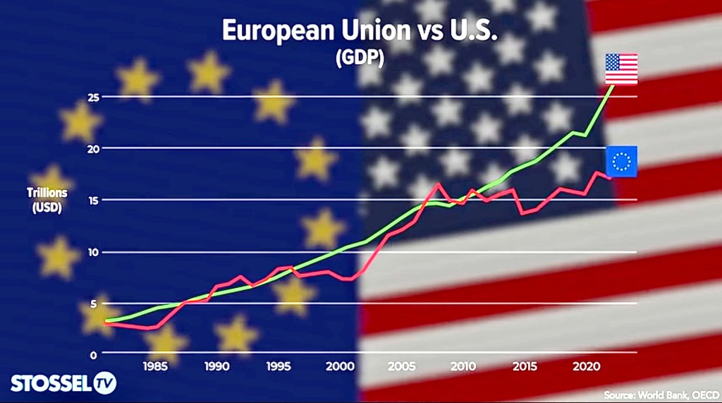 Not a lot Americans realize that Europe has really fallen off economically in the last 10-15 years. John Stossel featured the stagnation in a VIDEO recently. The US GDP is now >50% higher than Europe, despite the EU having almost 200 million more people …!
