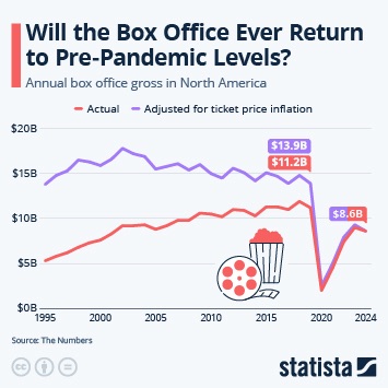 The forecast is that the theater industry will once again break the $10B mark in 2025, but that’s being helped by inflation in the US dollar over time. More & more people are waiting for movies to get to streaming and watch at home.