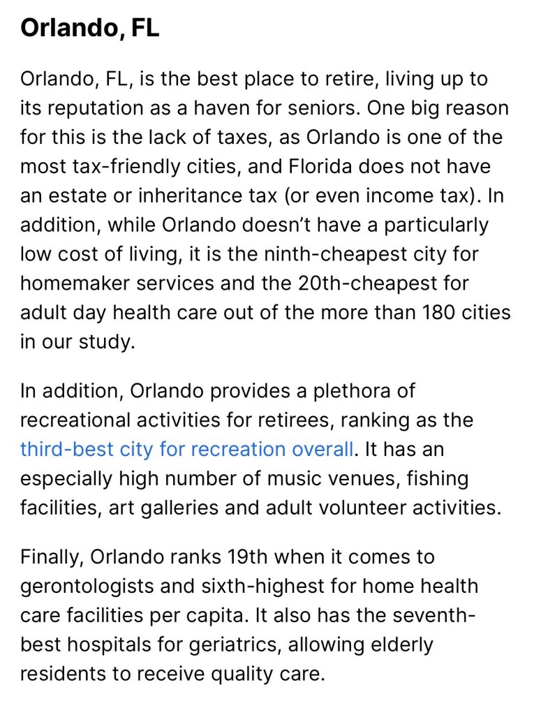 It caught my attention because Orlando – where we are hanging out at our vacation place right now – was ranked #1 in the country. It was 1 of 4 Florida cities ranked in the Top 10 with Miami, Tampa, and Fort Lauderdale. I think everyone is used to seeing Florida cities as key destinations for retirees.