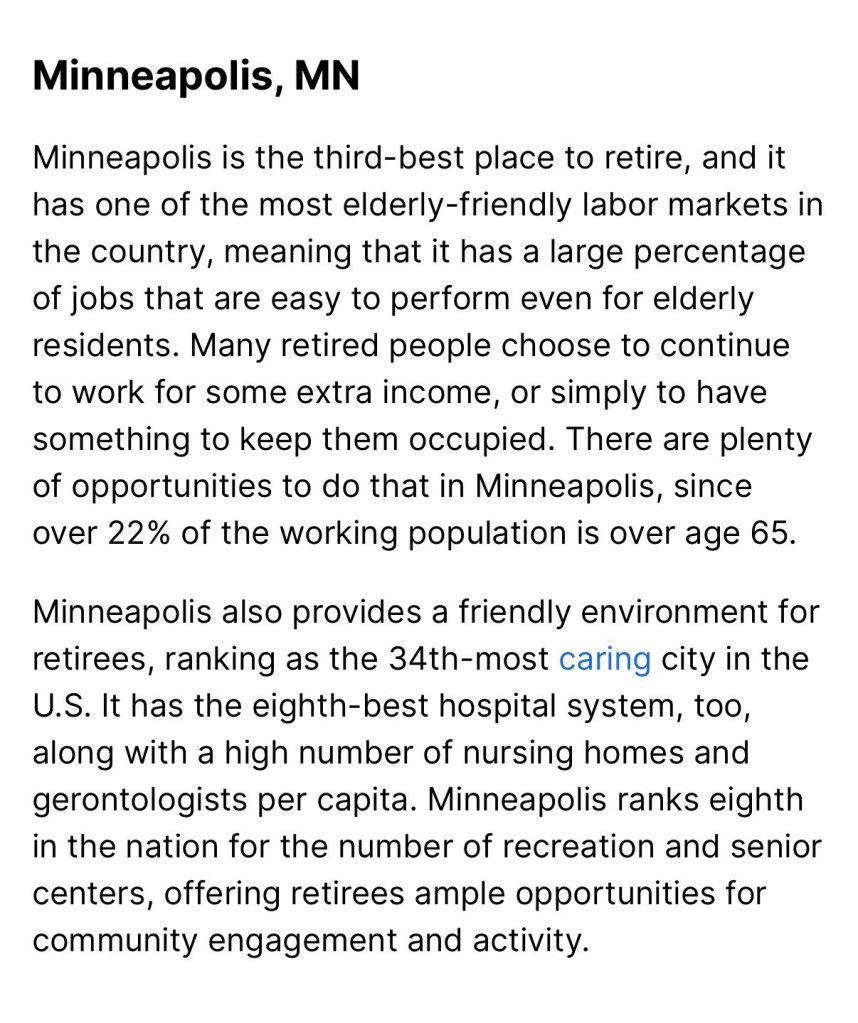 That’s right, the author thinks that seniors finding WORK is critical for being ranked highly on this list. He notes that the metro has “one of the nation’s most elderly-friendly labor markets” and “22% of [Minneapolis’] working population is over the age of 65”. Of course they are, genius – they need to pay for the high taxes and low affordability!