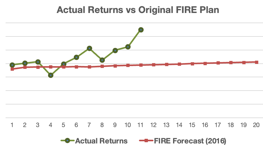 In fact, 2025 looks like it is the absolute best year of the 10 years since I retired early. You can see from the graph below that our retirement portfolio is almost now 167% of where I expected we would be at this point (FIRE Forecast 2016). You can see that overall, our investments have had 3 solid years in a row. (In fact, up 6 of the last 7 years)!