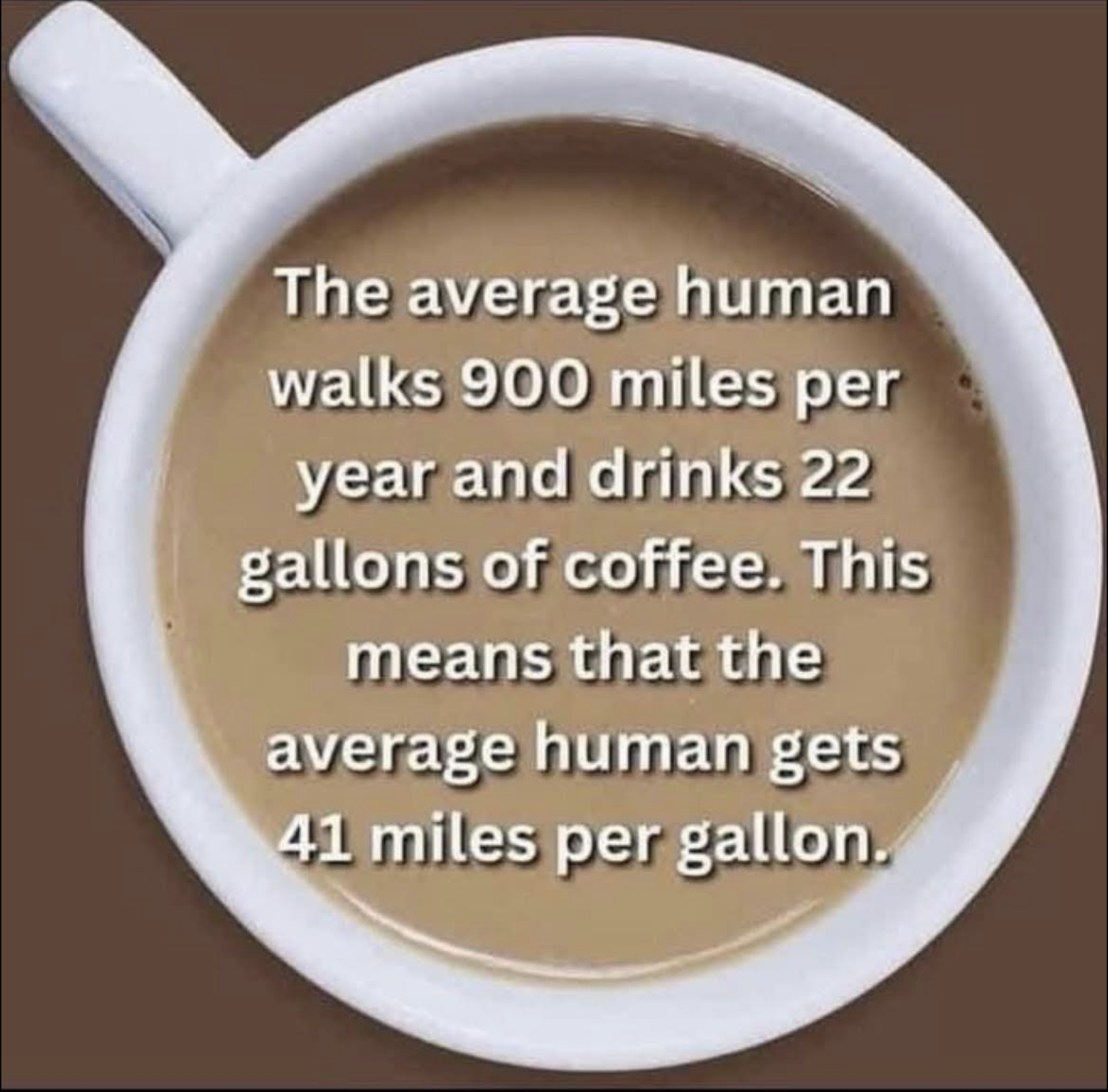 1. I drink two cups per day, which works out to 45 gallons per year. I am walking at least 2 miles per day with my dogs which works out to 730 miles per yea, so multiply by 150% to capture the walking I am doing without my cell phone for a total of 1,095 per year. 1095 miles / 45 gallons= 24.3 MPG. I am a modern SUV driving on the open highway.