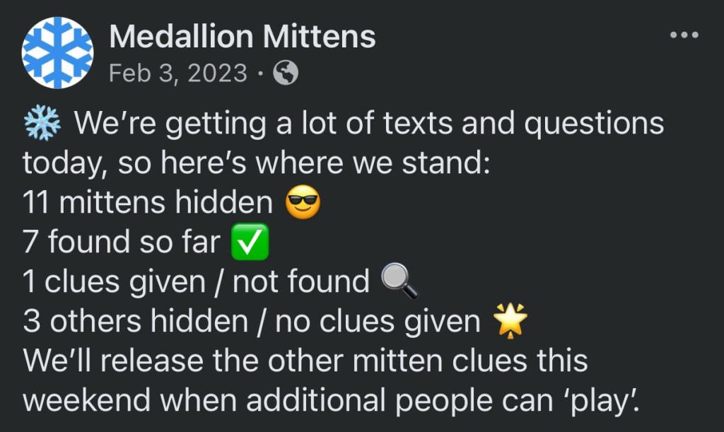- Text the 2 pictures & coordinates to everyone else on the Mitten Squad